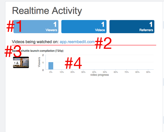 The realtime view provides you with detailed information regarding all of your videos that are being watched now. Here you can see the total number of videos being watched right now, the number of users watching them, and how far each user has progressed.